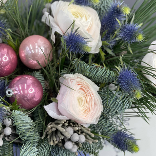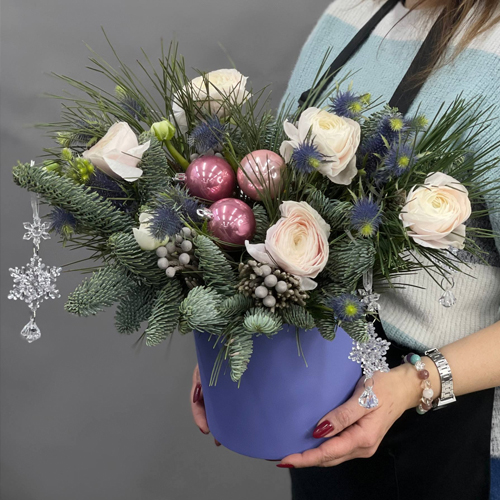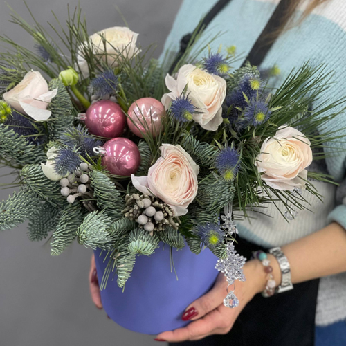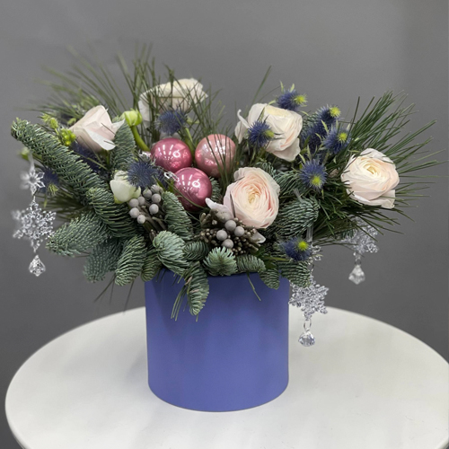 Композиция в шляпной коробке "Снежная королева" из нобилиса, ранункулюса, брунии и эрингиума