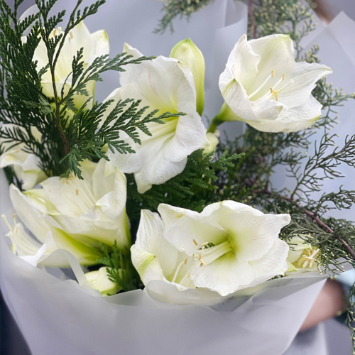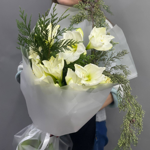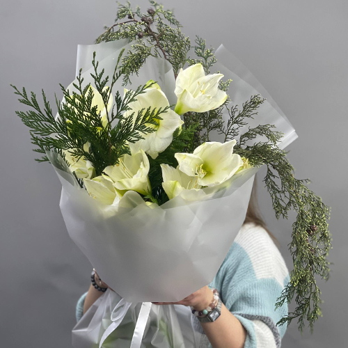Букет "Путеводная звезда" из белых амариллисов и нобилиса