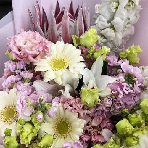 Букет "Минор" из протеи, ароматных маттиол, эустом, гербер и дельфиниума