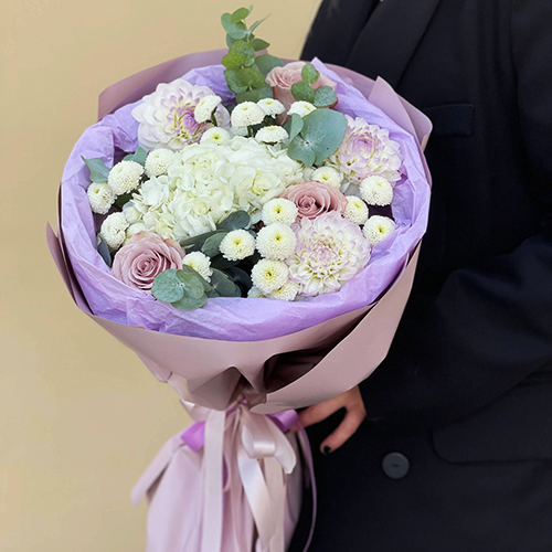 Букет "Динь" из георгин, хризантем сантини, эвкалипта, роз и гортензии