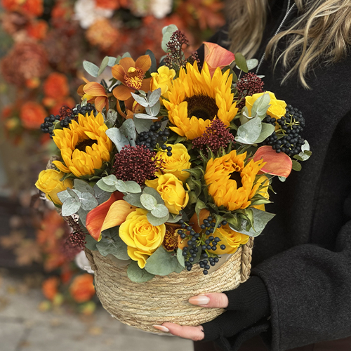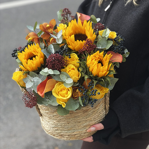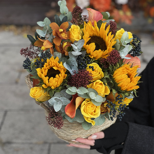 Композиция в сумке "Тональность" из подсолнухов, калл, ягод вибирнума, лимонных роз, скиммии и орхидеи
