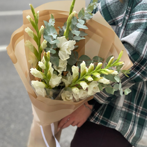 Букет из 5 белых гладиолусов и эвкалипта