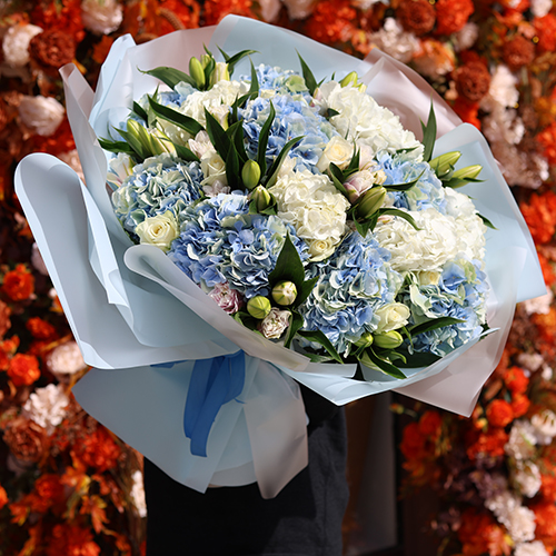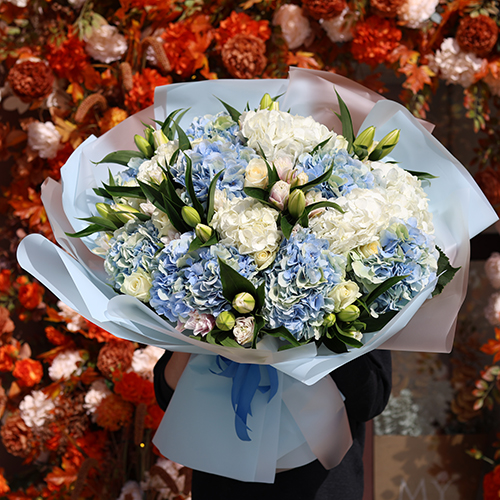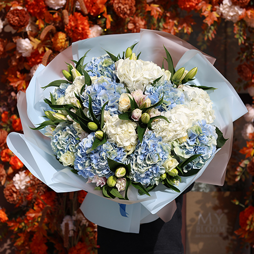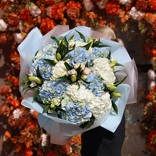 Букет "Елизавета" из гортензий, роз и пионовидных ароматных лилий