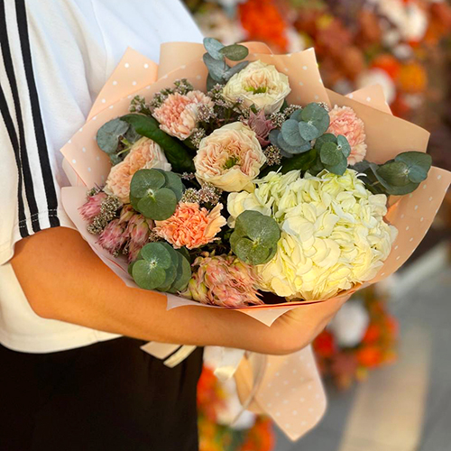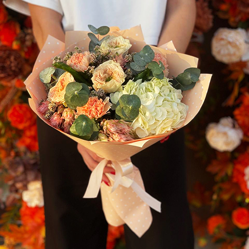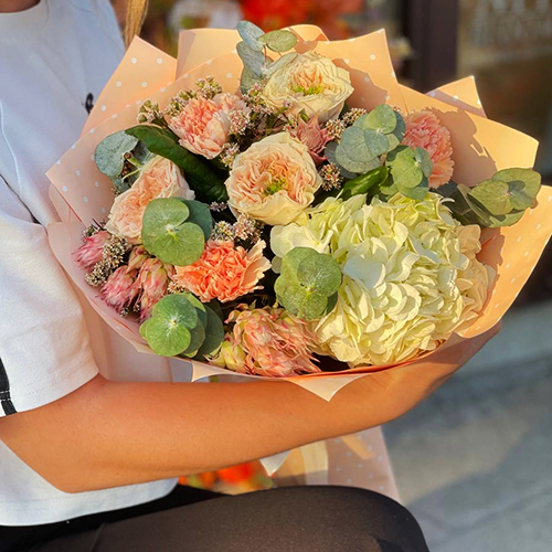 Букет "Сливочный крем" из гортензии, пионовидных роз, диантусов и серрурии