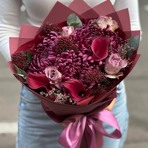 Букет "Импульс" из скиммии, калл, роз и хризантем Бигоуди