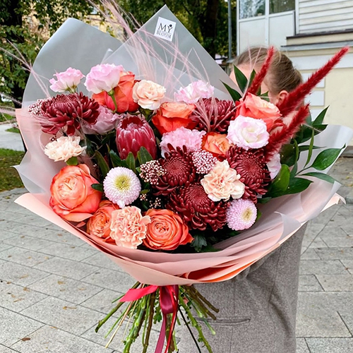 Букет "Каркаде" из хризантем Бигоуди и Момоко, роз Эквадор Кахала, озатамнуса, эустом, протеи, и диантусов