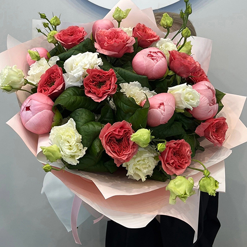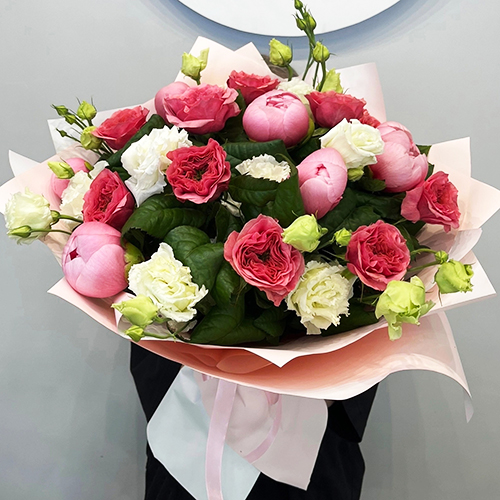 Букет "Нежные прикосновения" из пионовидных роз Риджентс Парк, эустом и пионов Салмон