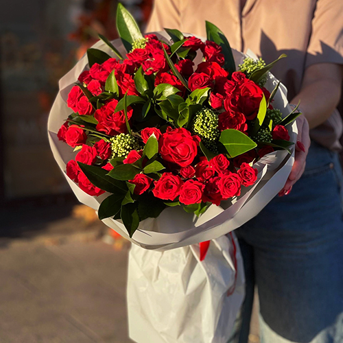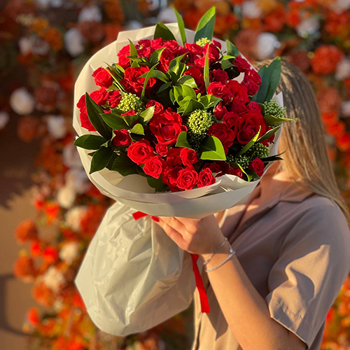 Букет "Всё возможно" из кустовых роз, скиммии, роз Эль Торо и рускуса