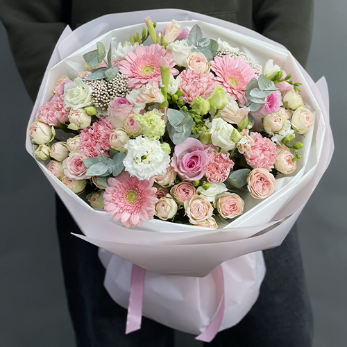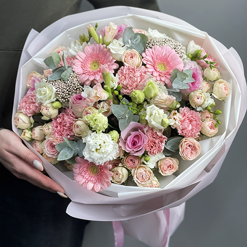 Букет "Я с тобой" из роз, эвкалипта, гербер, ароматных фрезий, озатамнуса, эустом и диантусов