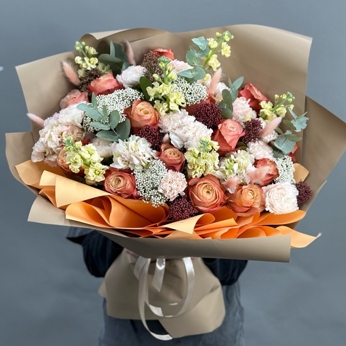 Букет "Татьяна" из маттиол, гортензий, роз Эквадор Кахала, диантусов, скиммии и озатамнуса